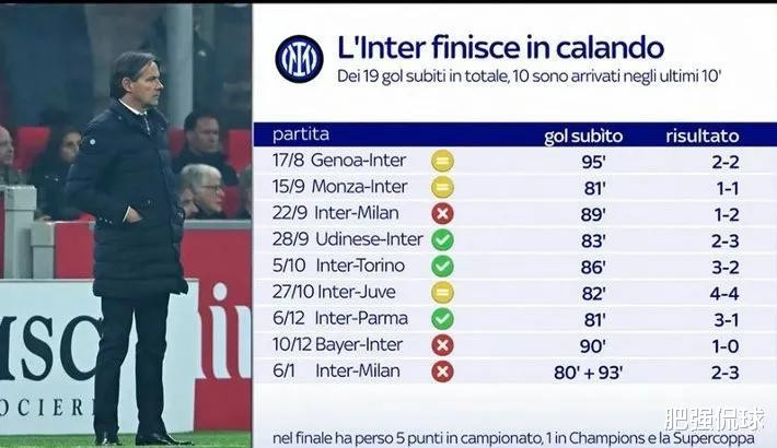 这赛季多场强强对话拿不下来,好多时候都是终末衔接没撑住,而这恰是因为球队气势乐龄化带来的缺欠。左证统计,本赛季于今国米一共丢了19球,其中10球是在比赛终末10分钟丢掉的,占比高达53%。在这10粒丢球出现的9场比赛中,国米胜率独一崇敬的33%,而况赢下的都如故乌迪内斯、都灵、帕尔马这么的弱旅。