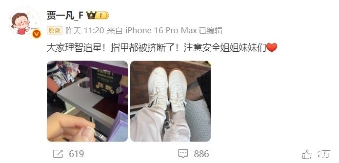 4月6日,中国羽毛球奥运冠军贾一凡在酬酢媒体发布了一条令东谈主揪心的动态:“各人千里着安妥追星!指甲皆被挤断了!”