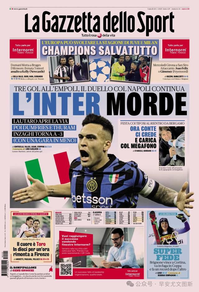 2、国米紧咬不放。对阵恩波利攻入三球,与那不勒斯的决斗仍在延续。劳塔罗为班师铺平说念路,然后邓弗里斯和图拉姆。小因扎吉回到只差3分(还有一场补赛在手)。